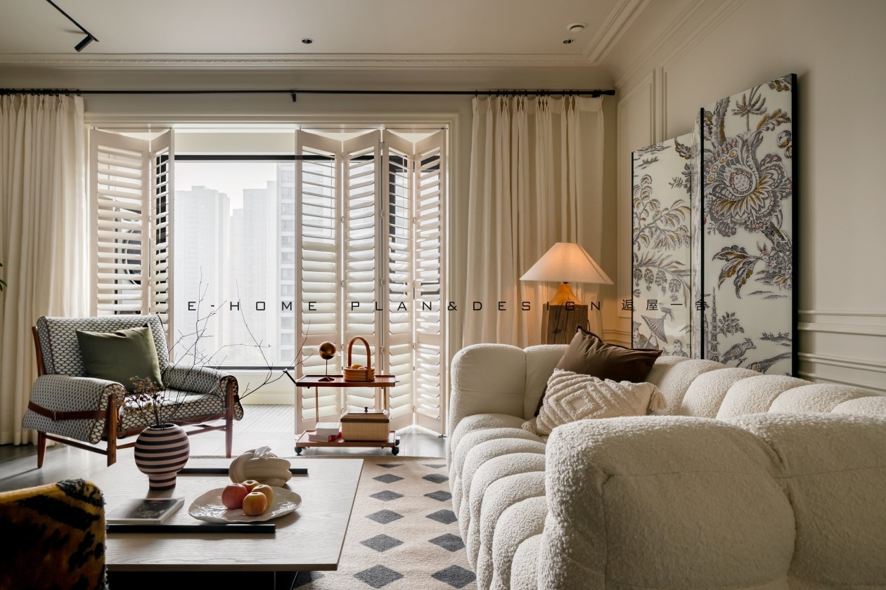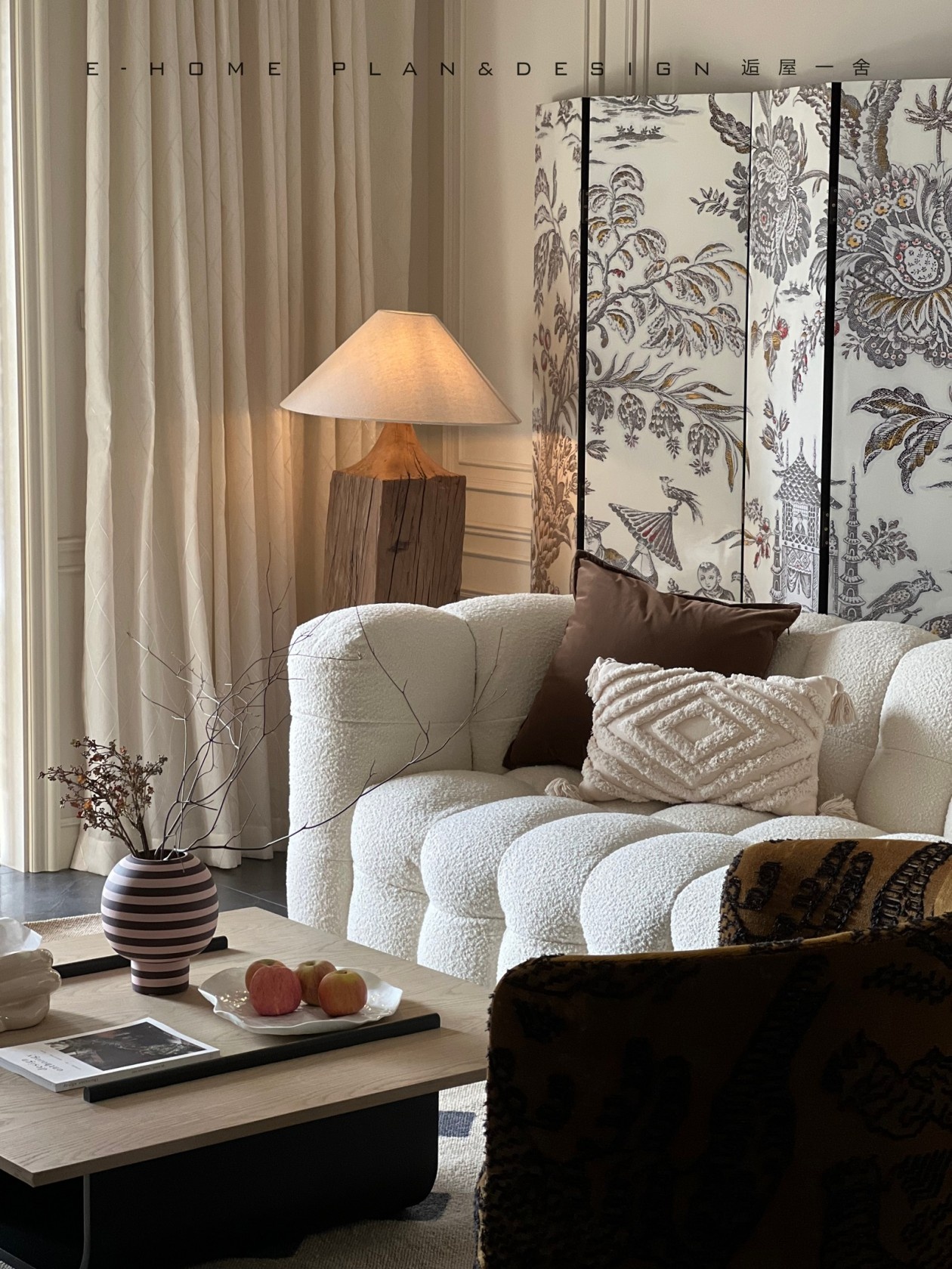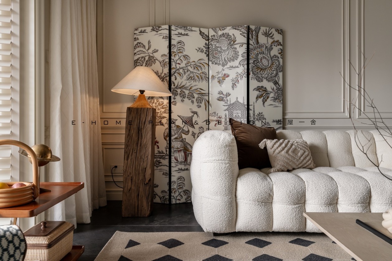 屏风是一个很好的叙事者,几折轻巧的摆放,落地灯笔直站立,时间的厚重感被凝聚点亮,在客厅晕开丰富层次的氛围,一家三口聊聊天也很惬意。