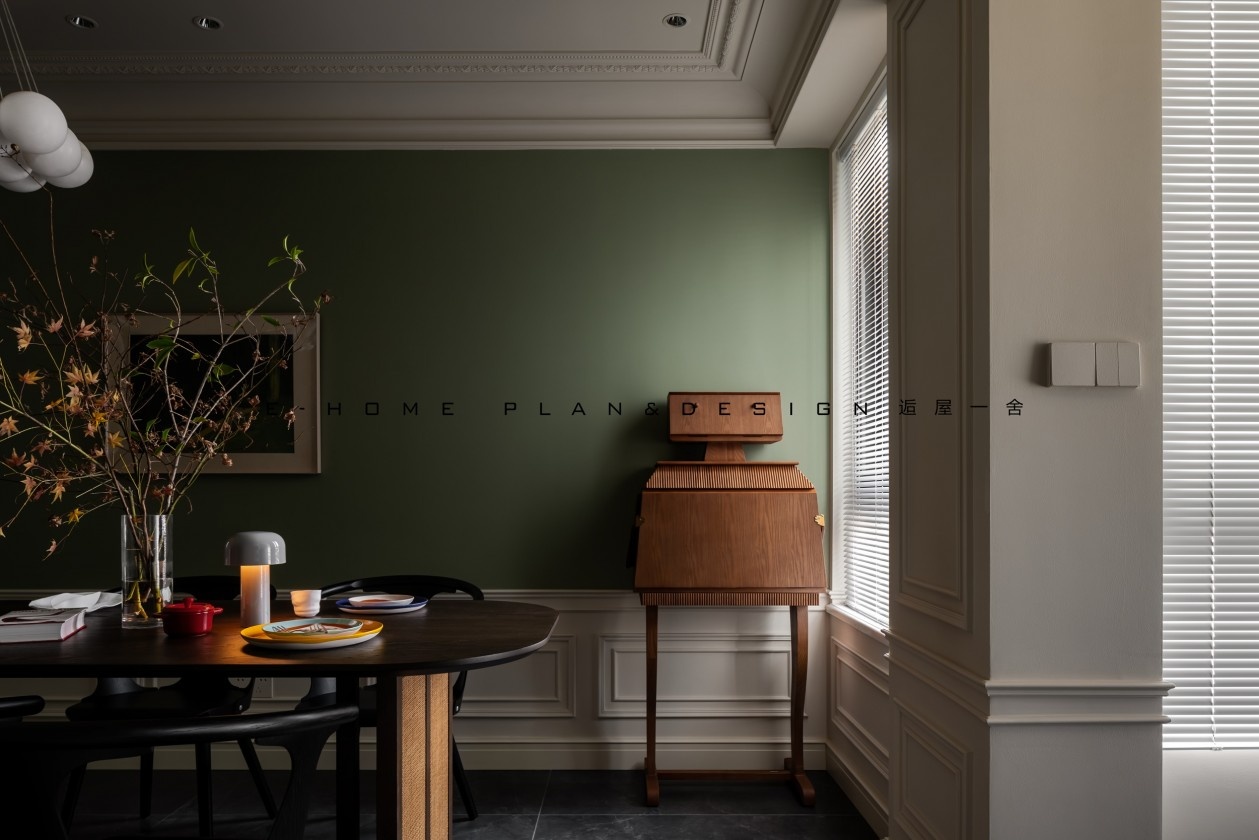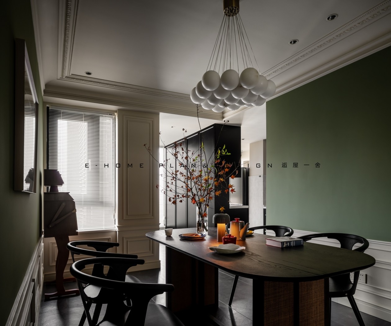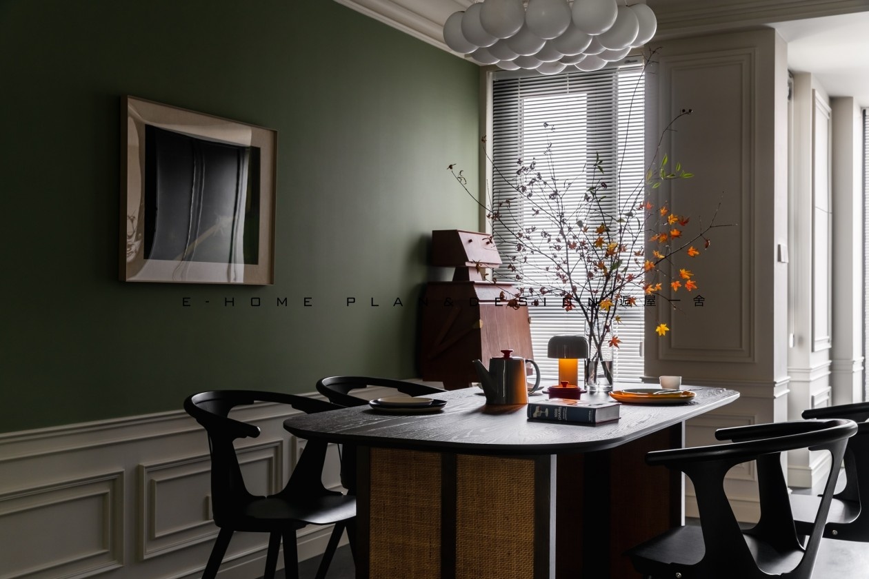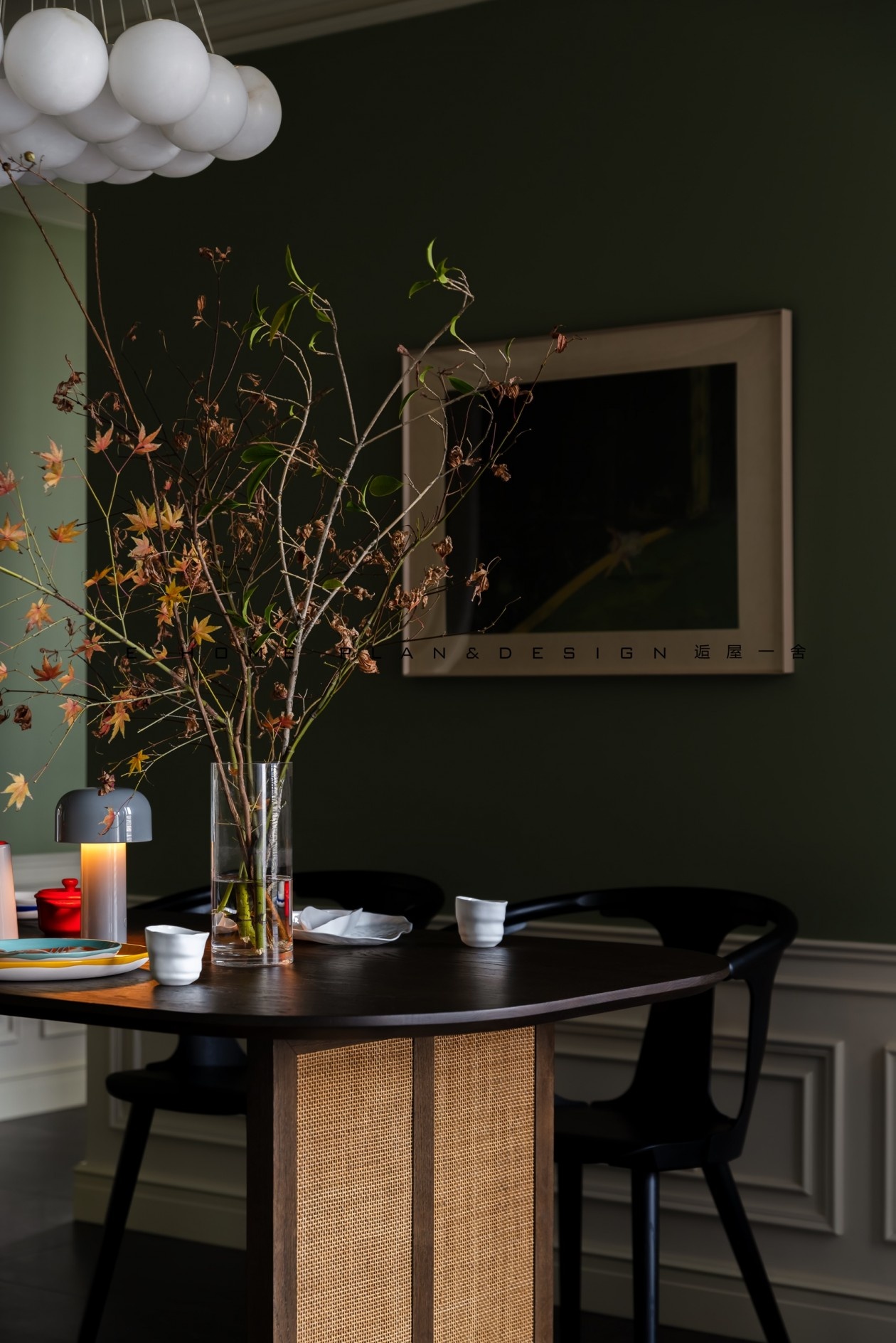 画廊般的餐厅引人驻足,大自然的绿意被设计师引入室内,暗色调的底妆让餐厅变得可塑性极强,即使在小区捡来一把枯枝,也能让这里光彩夺目。
