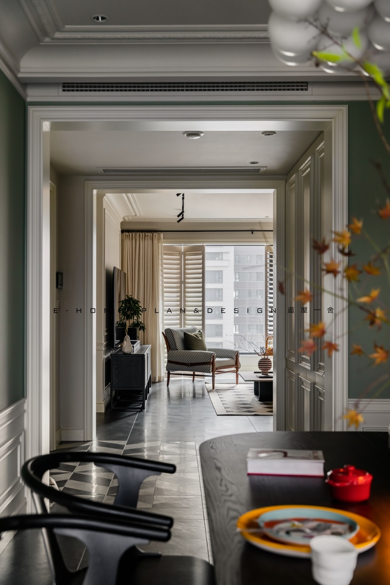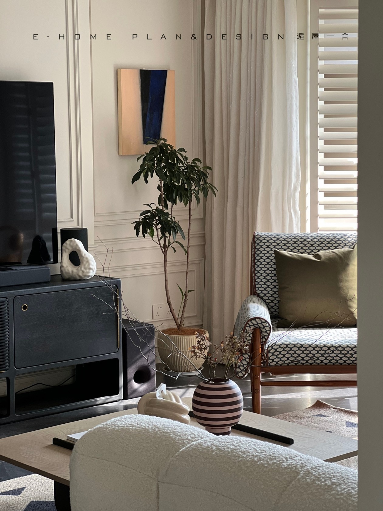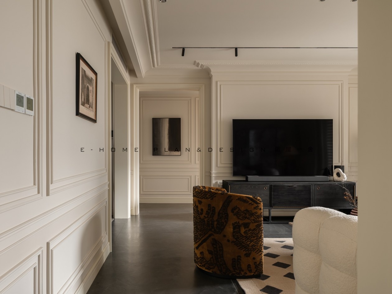 在屋主喜欢的家居氛围中,线条的游走最能展示出想要的风韵,设计师在大面积运用之余,又用色彩轻轻点缀。