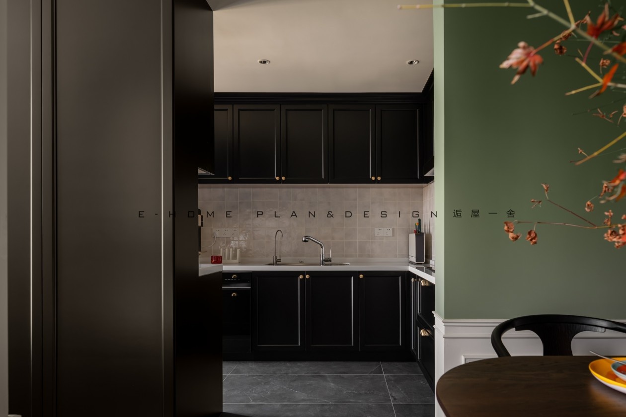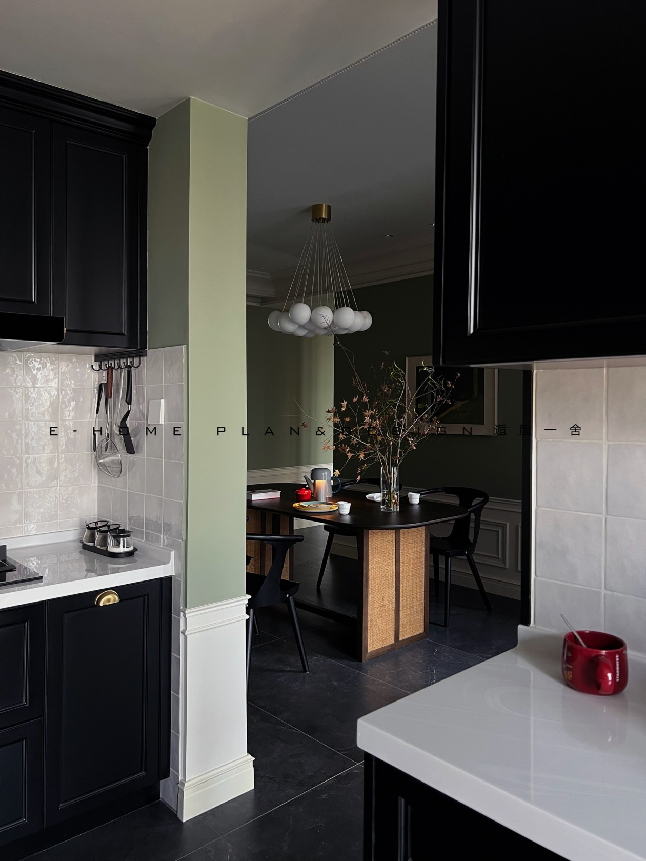 设计师把原有阳台的位置挪进室内,重建餐厨空间,增加的一组黑色收纳柜分流出两条宽敞的通道,更流畅的动线贯穿在这个家中。