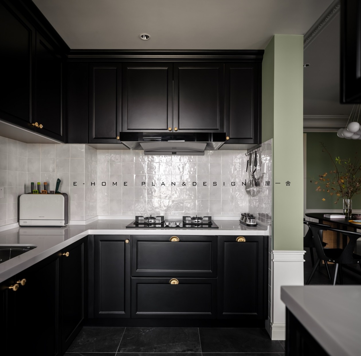 酷酷的黑色橱柜被金色把手点亮,小砖的铺贴让复古意味更深,收纳充足使得台面更简洁宽敞,能收起来的东西就全部藏在柜子里吧。
