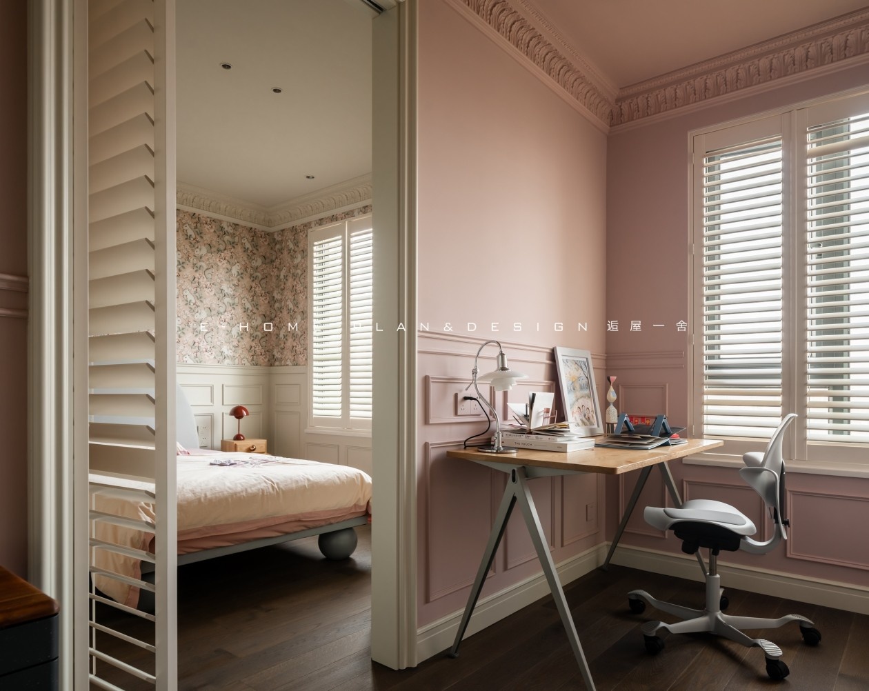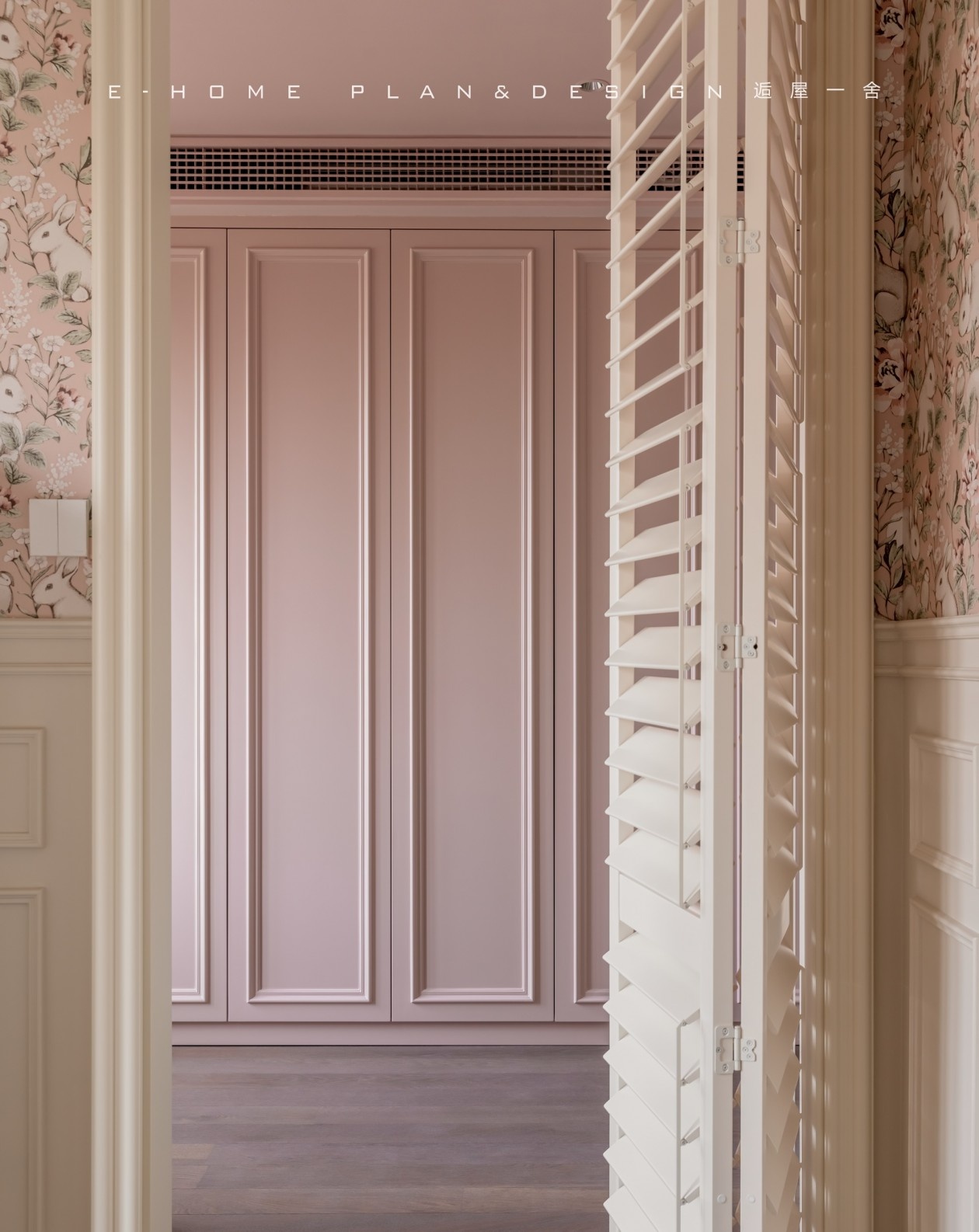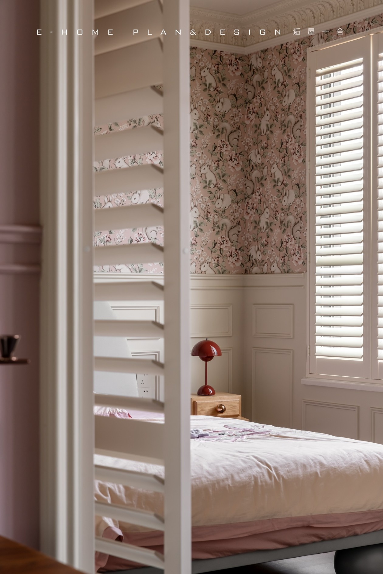 壁纸、角花和百叶门,出现在这个房间的元素,散发着少女气息。