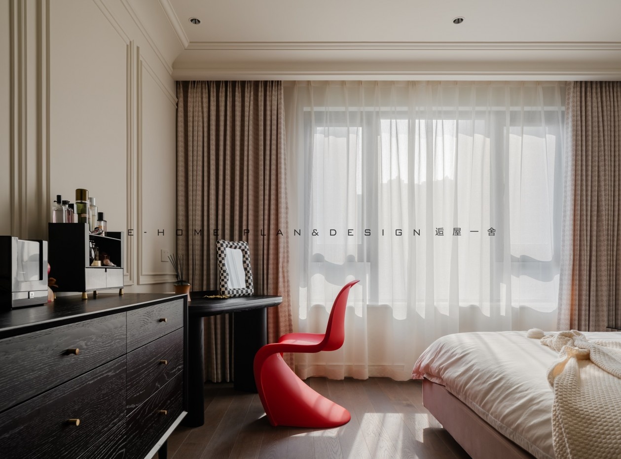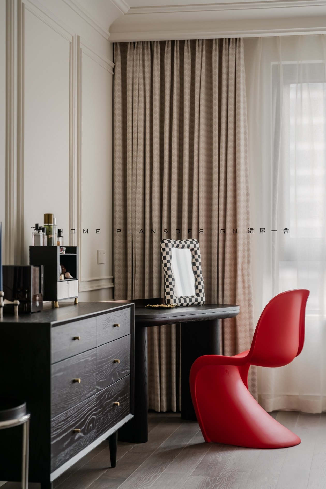 床尾的斗柜和梳妆台,平时也能做书桌来用,Vitra Panton Chair的经典磨砂红,犹如一支口红的优雅填补空间。